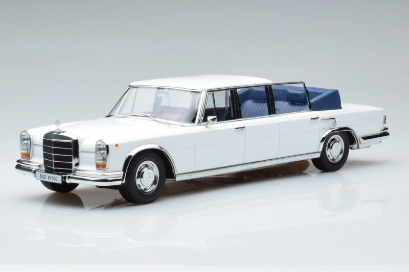 A 1:18 scale model measures approximately 25-28 cm (approximately 10-11 inches). The Mercedes 600 Pullman W100 Landaulet Blanc KK-Scale 1:18 is perfect for display in a glass cabinet or on a shelf.