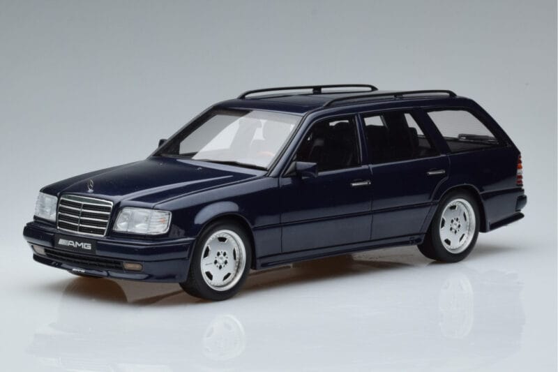 A 1:18 scale model measures approximately 25-28 cm (approximately 10-11 inches). The Mercedes E36 AMG S124 Bleu Otto 1:18 is perfect for display in a glass cabinet or on a shelf.