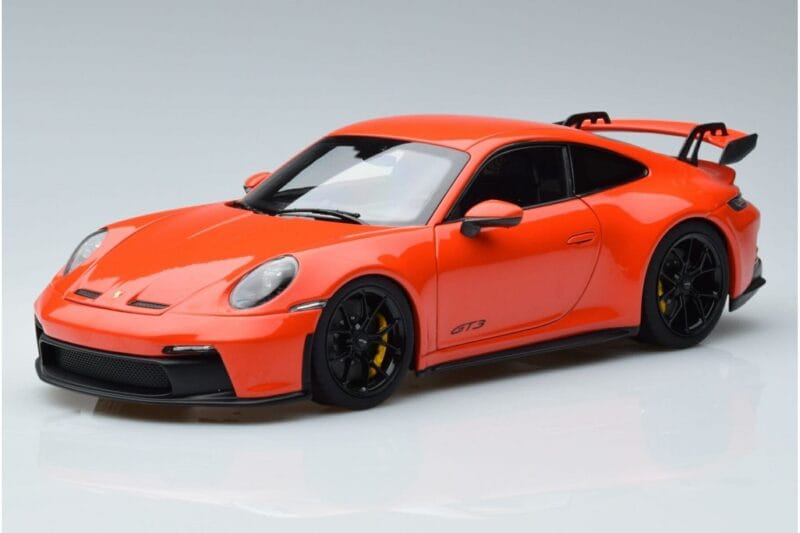 A 1:18 scale model measures approximately 25-28 cm (environ 10-11 pouces). The Porsche 911 992 GT3 Coupe Orange Norev 1:18 is perfect for display in a glass cabinet or on a shelf.