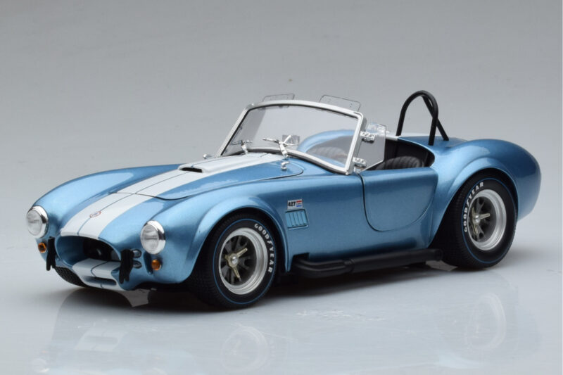 A 1:18 scale model measures approximately 25-28 cm (approximately 10-11 inches). The Shelby Cobra 427 S/C Bleu Clair Kyosho 1:18 is perfect for display in a glass cabinet or on a shelf.